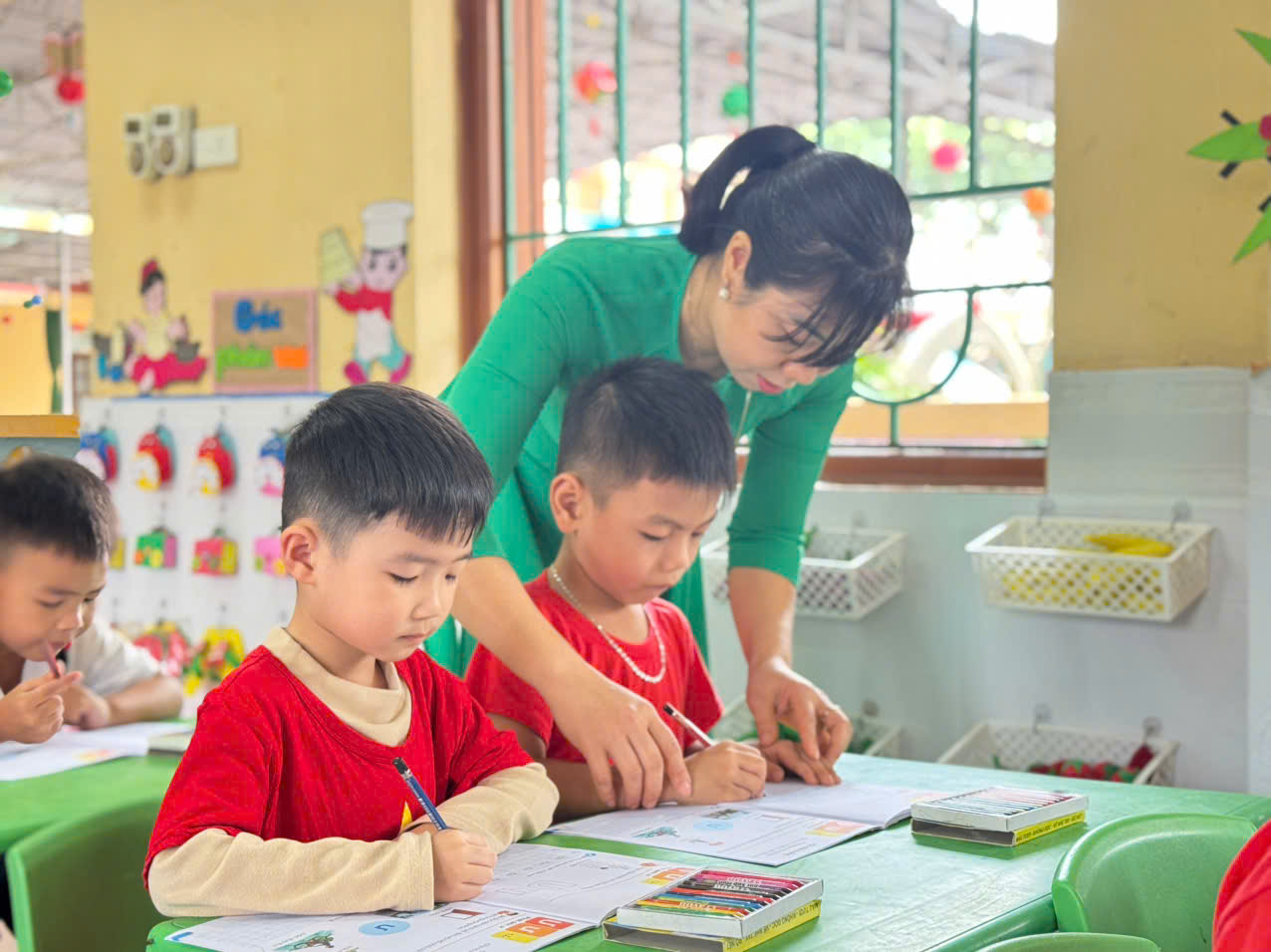 Cô Hương nhẹ nhàng đồng hành, chỉnh từng tư thế ngồi, từng cách cầm bút, động viên để các bé tự tin hoàn thành bài.