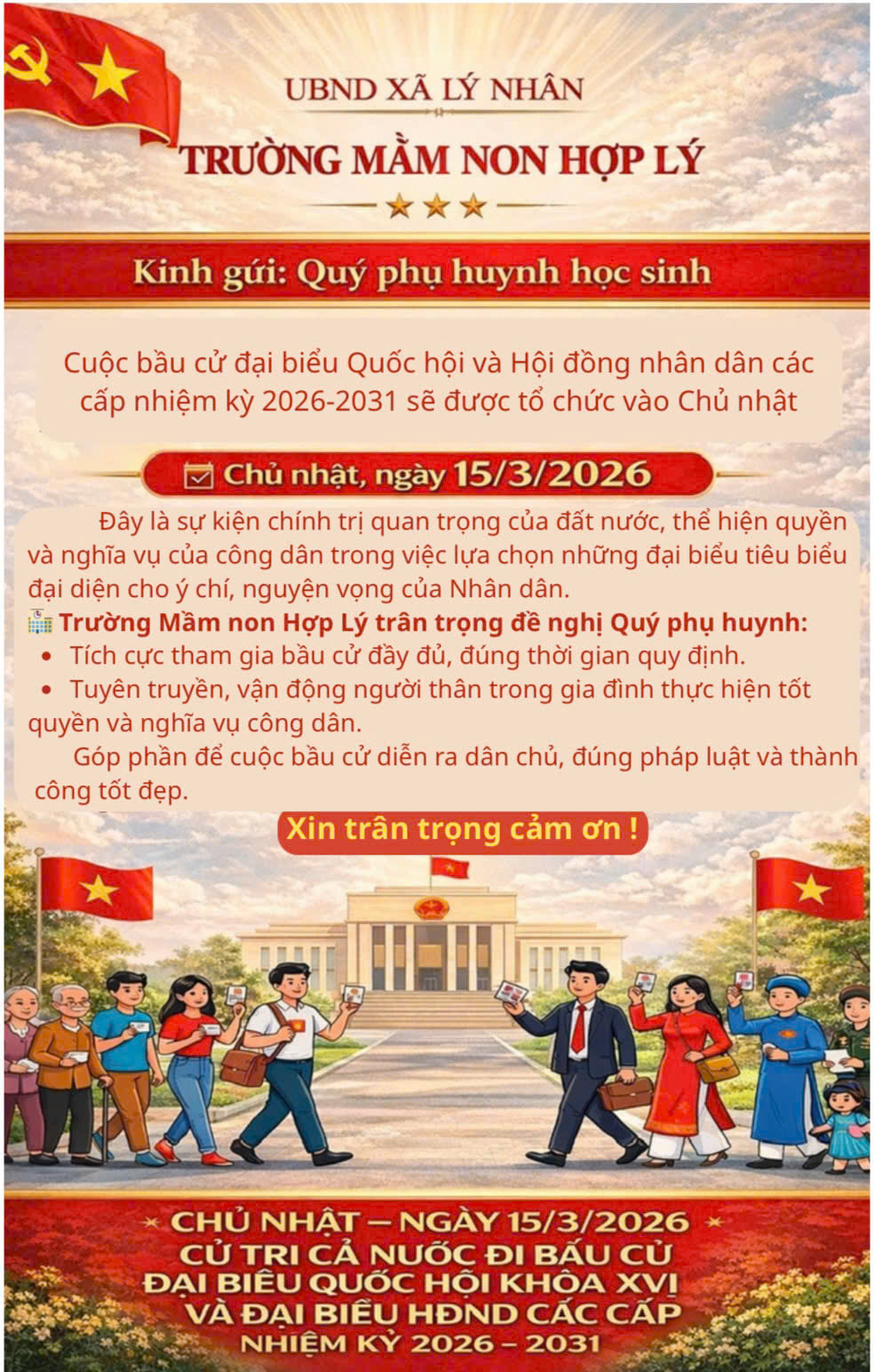 🏫 Trường Mầm non Hợp Lý trân trọng đề nghị Quý phụ huynh tích cực tham gia bầu cử đầy đủ, đúng thời gian quy định; đồng thời tuyên truyền, vận động người thân trong gia đình thực hiện tốt quyền và nghĩa vụ công dân.